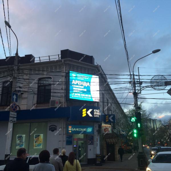 Экран находится на пересечение улиц Красной и Карасунской, а этот перекресток является максимально оживленным в городе. Именно здесь часто можно наблюдать заторы и пробки. Как можно с пользой провести это время? Смотреть на светодиодный экран, расположенные на здании "Край Инвест Банка", который пассажиры транспортных средств могут видеть с любой точки улицы. Кроме того, рядом расположено много объектов, которые постоянно привлекают жителей города, это кафе, магазины, и банки, учебные заведения и многое другое. А при том, что на экране транслируется «Первое уличное телевидение», отличающееся интересным и актуальным контентом, зрители всегда с удовольствием обращают на экран свое внимание.